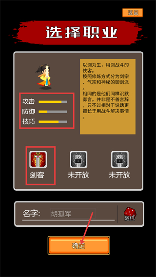 1、选择【剑客】职业(攻击与技巧属性突出),确认角色名后点击【确定】,即可创建该职业角色进入游戏。