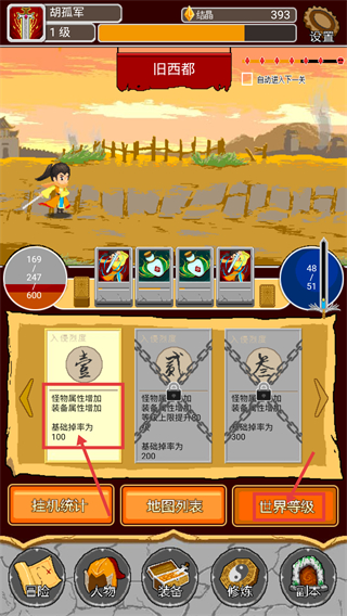 3、通过【世界等级】界面查看入侵烈度,当前烈度下怪物与装备属性会增加,基础掉率为100。