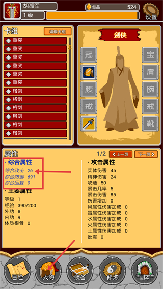 4、点击【人物】界面可查看【综合属性】(如综合攻击26),同时能管理卡组与装备,优化角色战力。