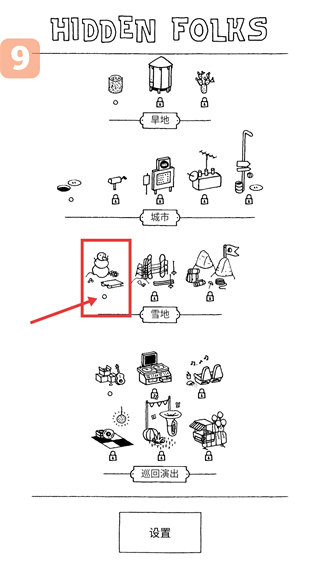 1、看到【HIDDEN FOLKS】界面,点击红色框选的雪地场景入口,进入雪地区域的隐藏角色寻找关卡。
