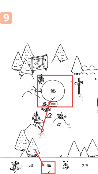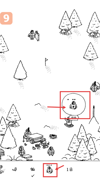 2、进入雪地场景后,定位红色框选的目标区域,点击完成首个隐藏角色寻找,底部出现对应勾选标识。