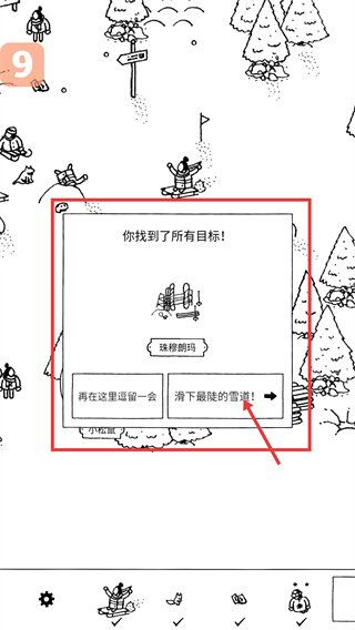 4、出现“你找到了所有目标!”提示后,点击红色框选的“滑下最陡的雪道!”按钮,进入后续游戏环节。