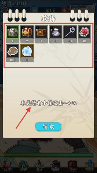 1、领取界面中的奖励可获得【宝箱】【钻石】【玫瑰】等资源,本关小怪攻击减50%的buff能助你轻松应对后续战斗。