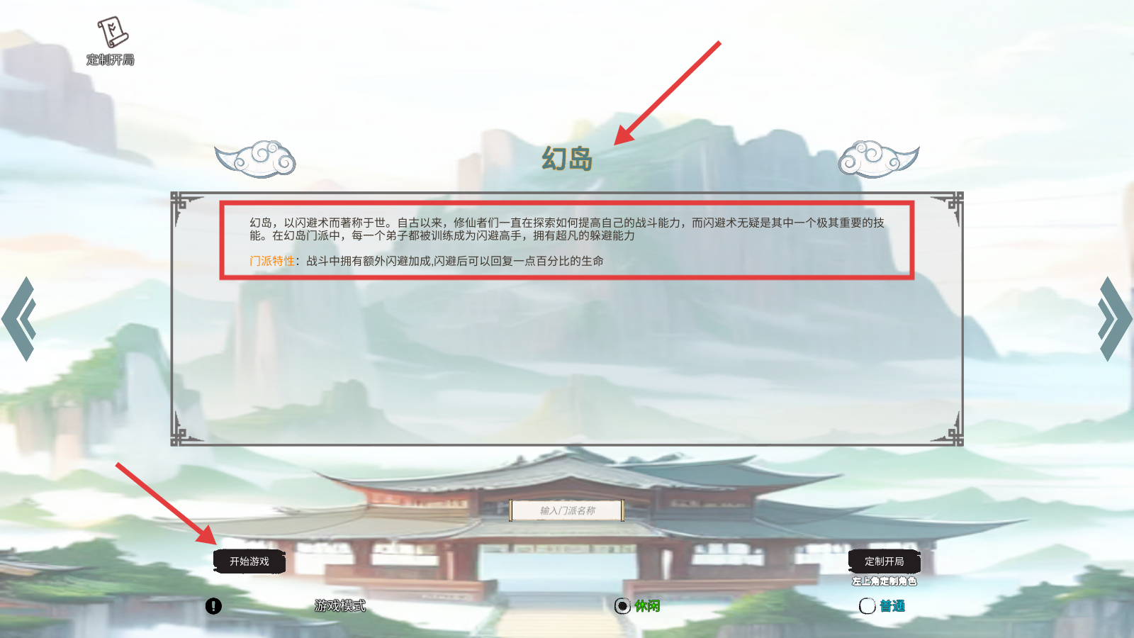 1、选择【幻岛】门派,其特性为战斗中额外闪避加成且闪避后回血,点击【开始游戏】开启修仙之旅。