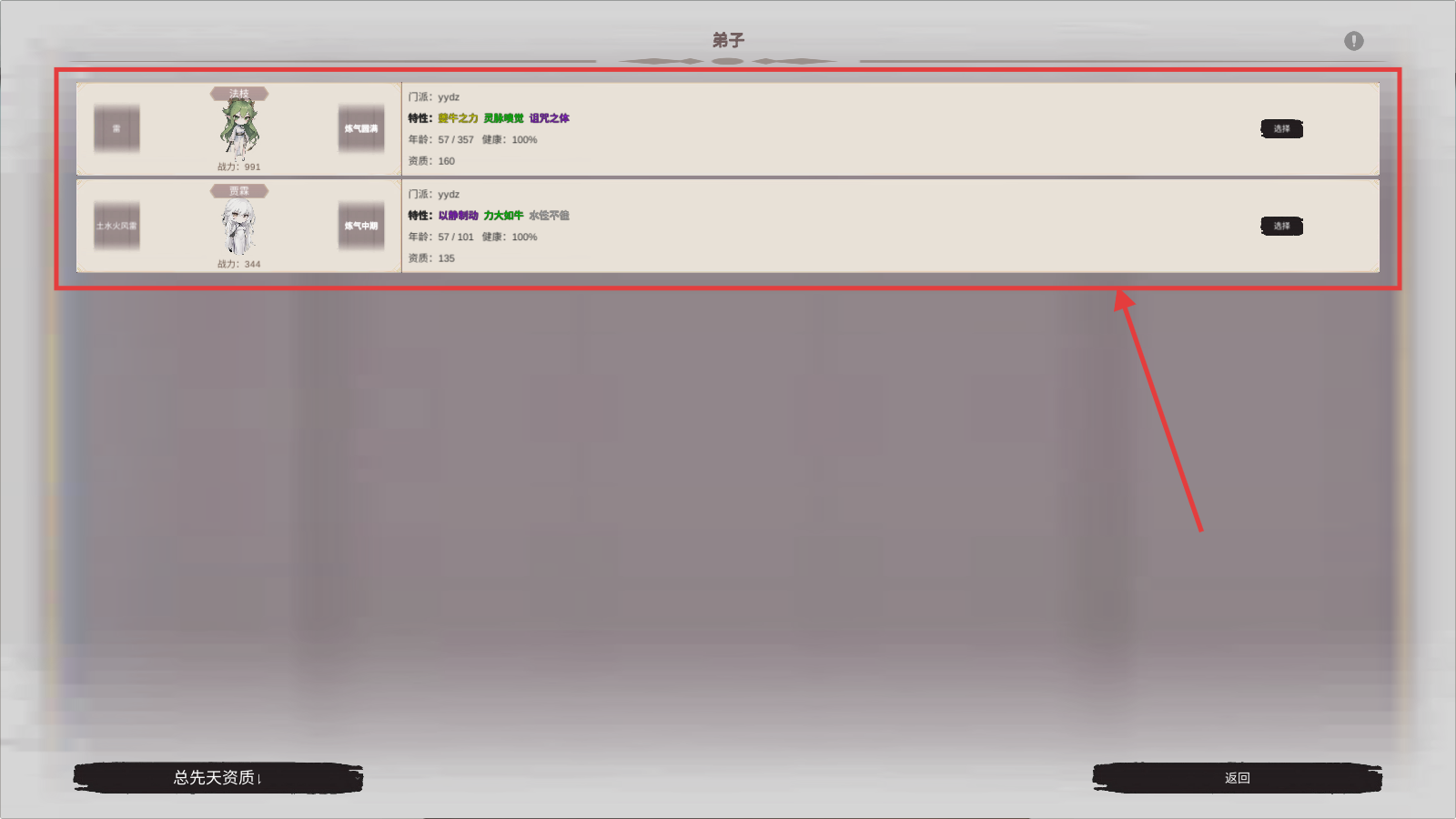 2、查看弟子列表,优先选择战力高的【流云】-【战力991】弟子,点击【选择】按钮纳入门派培养。