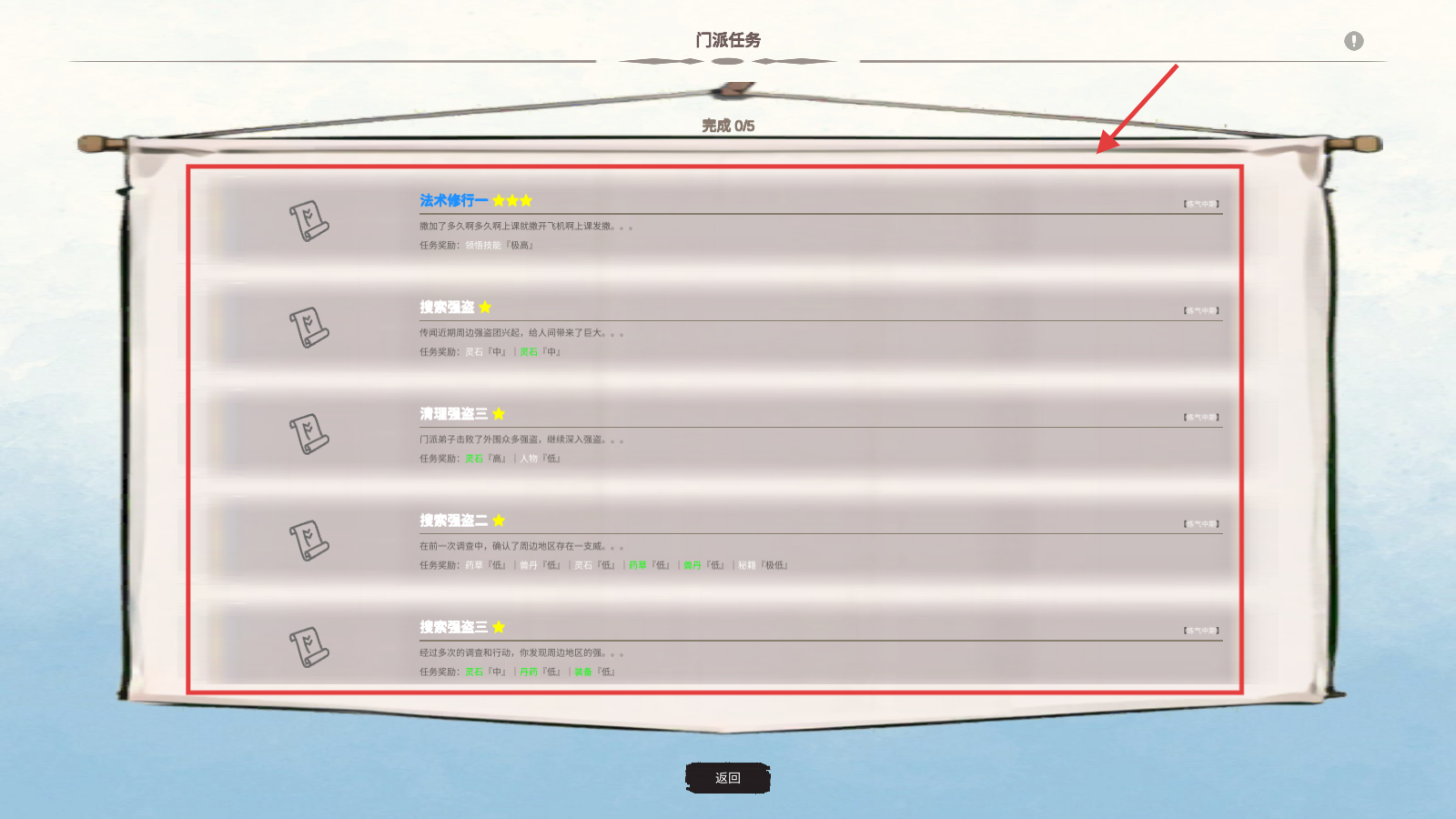 3、进入门派任务界面,优先挑选高星级的【法术修行一】-【四星】任务,准备指派弟子完成。