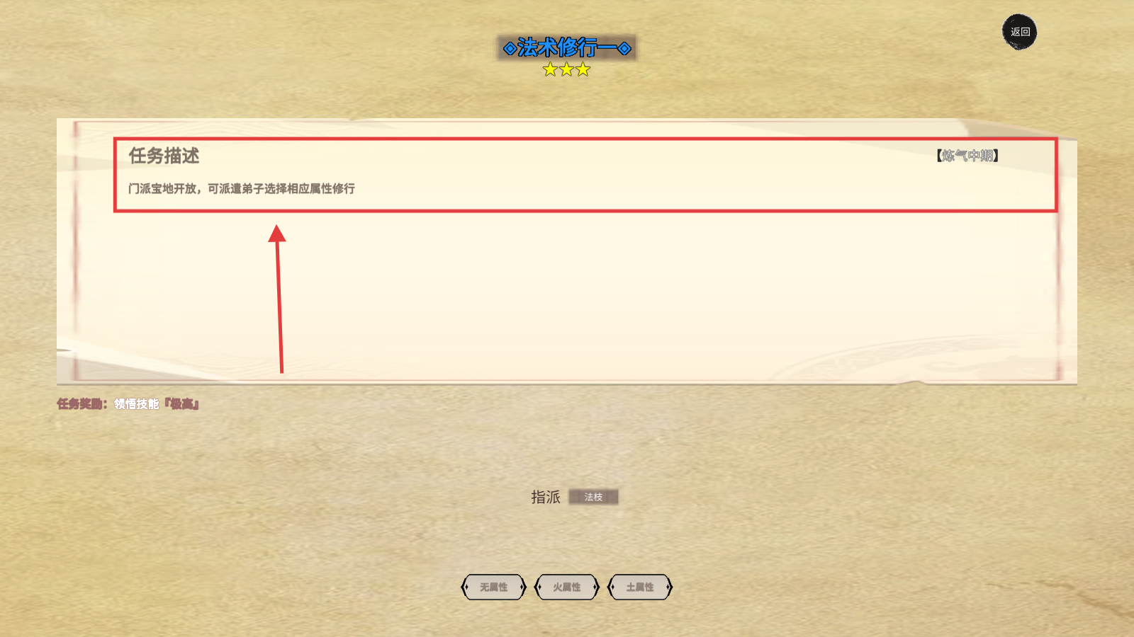 4、点击【法术修行一】任务,根据弟子属性选择【火属性】修行,完成可领悟技能【极速】。