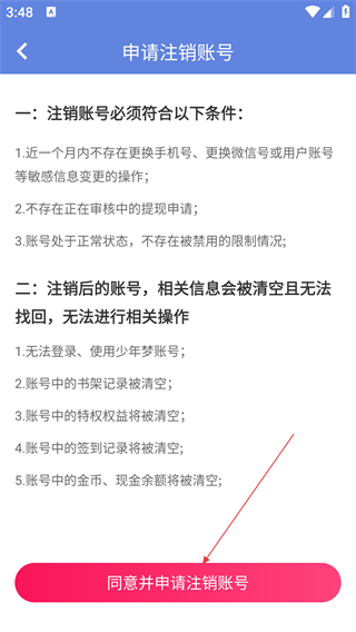 4、确认满足注销条件后,点击【同意并申请注销账号】,完成注销操作。
