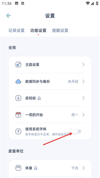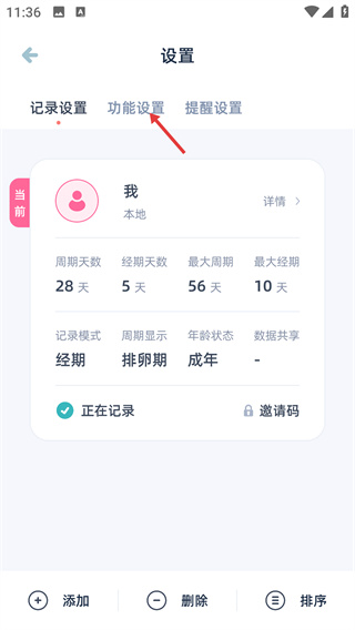 3、进入【设置】界面后,点击【功能设置】标签,切换到该标签页,可查看或调整记录、周期等相关的配置内容。