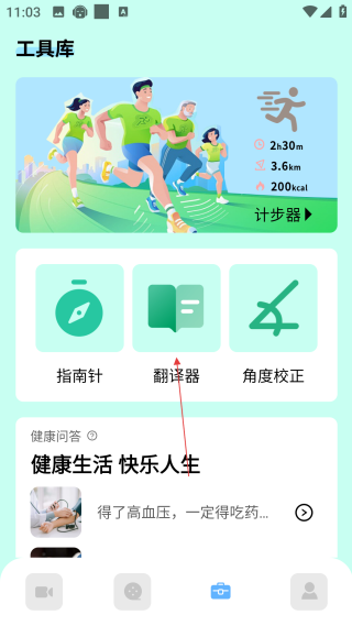 2、在工具库页,点击【翻译器】选项,进入语言翻译的操作界面。