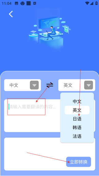 4、选择【需要翻译的语言后,填写内容】,点击【立即转换】按钮,即可完成语言的翻译操作。