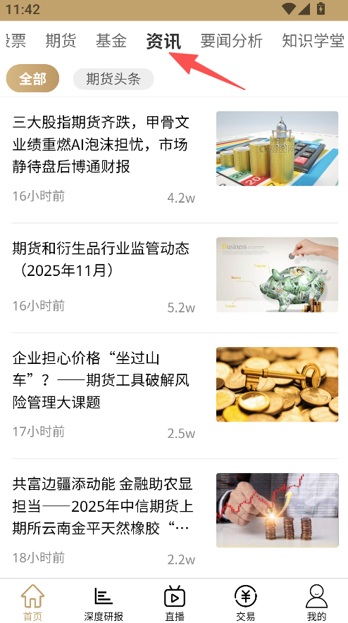 1、具备资讯板块浏览功能,进入对应板块,查看期货头条等分类下的金融资讯列表信息。