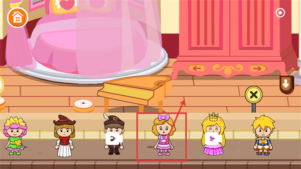 2、进入角色选择界面后,点击红色框选的小女孩角色,选定该角色并进入后续的童话场景互动环节。