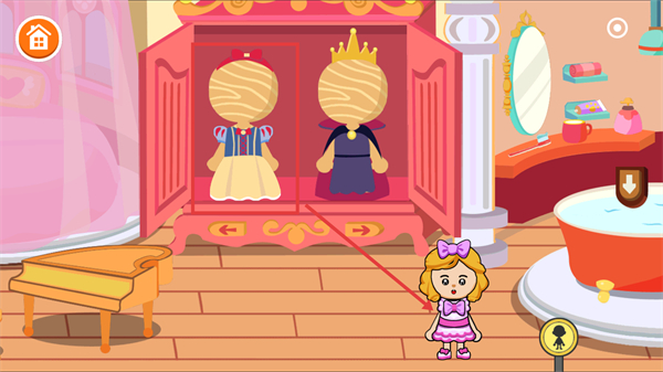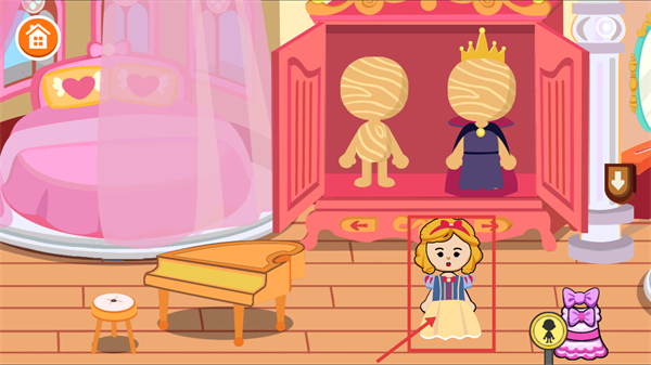 3、在童话场景的衣柜界面中,点击红色框选的装扮道具,为选定的小女孩角色更换对应的服饰装扮。