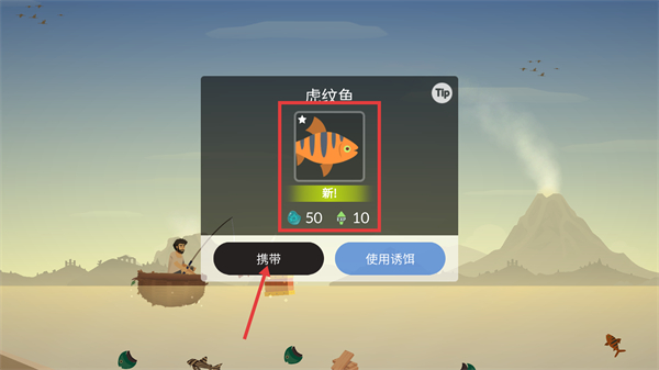 4、钓到【虎纹鱼】后,可选择【携带】留存该鱼,或使用诱饵提升后续钓取稀有鱼类的概率,同时积累【50】资源与【10】经验。