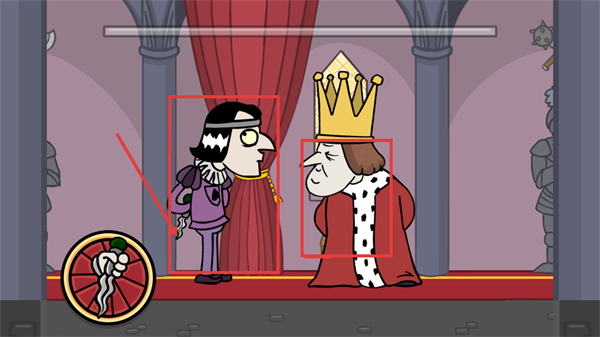2、红色框选的紫色角色与国王区域,紫色角色要小心国王发现小刀。