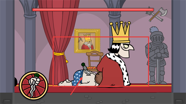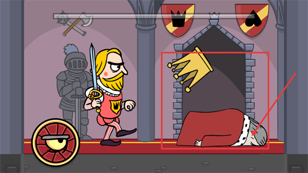 1、在当前场景,红色框选的国王与倒地角色区域,触发互动,推进关卡的剧情环节。