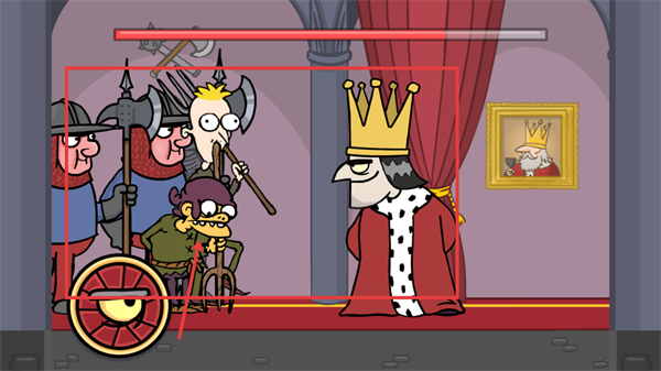 2、红色框选的卫兵与国王区域,回头发现刺杀,触发群体互动剧情,推进关卡的情节发展。