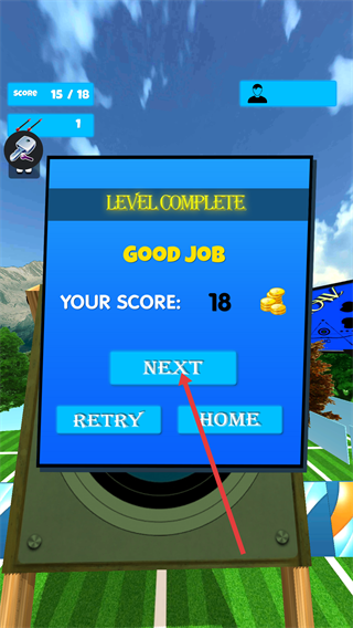 4、关卡完成后出现【LEVEL-COMPLETE】弹窗,查看当前得分后,点击【NEXT】按钮,继续进入下一个射箭关卡挑战。