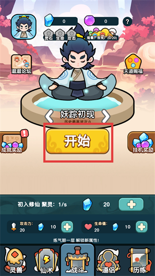 1、在主界面点击【开始】按钮,可通过挂机积累【初入修仙-聚灵】资源。