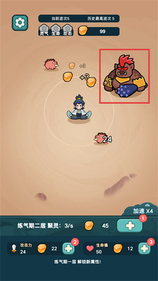 3、遇到强力妖怪时,利用已提升的攻击,击败后可获得更多奖励,推进【练气二期-聚灵】进度。