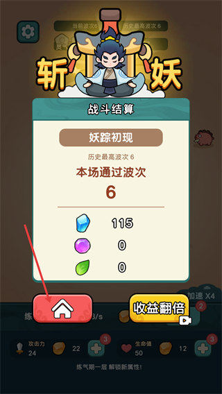 4、战斗结算界面显示信息,点击【home】返回主界面。
