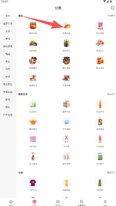 1、在首页进入分类页面,从左侧列表中选择美食点击快捷早餐。