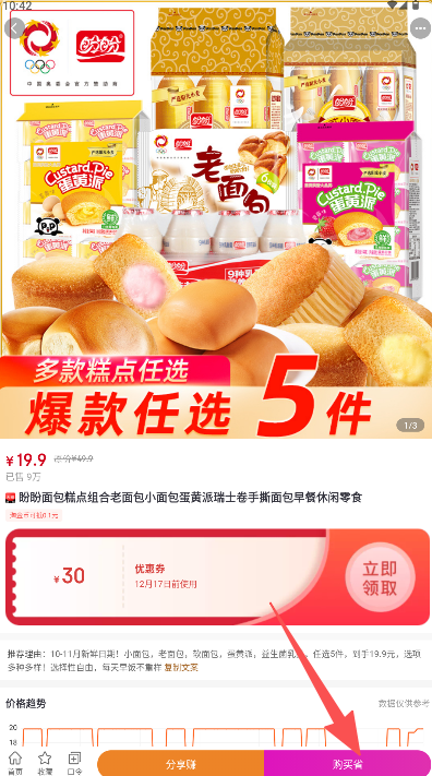 3、在商品详情页查看信息与促销活动点击领取优惠券底部按钮完成购买省。