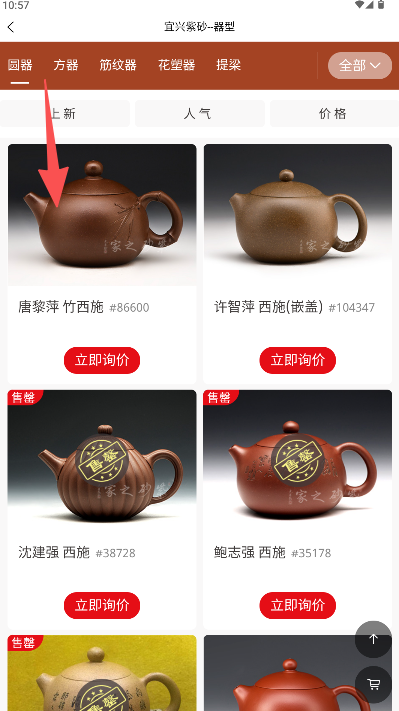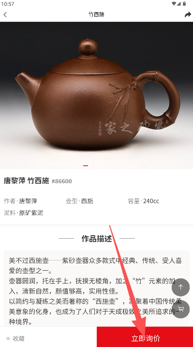3、在详情页查阅作者、壶型、容量、泥料与作品描述确认点击“立即询价”。