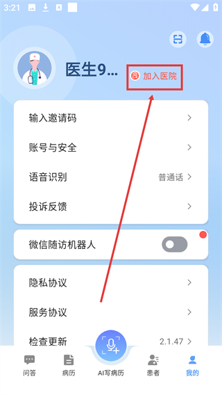 2、进入个人中心后,找到【加入医院】选项并点击,可进入加入医院的认证页面,准备填写相关认证信息。