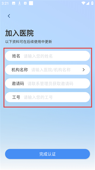 3、在加入医院页面,依次填写【姓名】【机构名称】【邀请码】【工号】等信息,完成认证资料的录入。