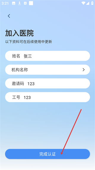 4、确认所有认证信息填写完毕后,点击页面底部的【完成认证】按钮,即可提交资料完成加入医院的认证流程。