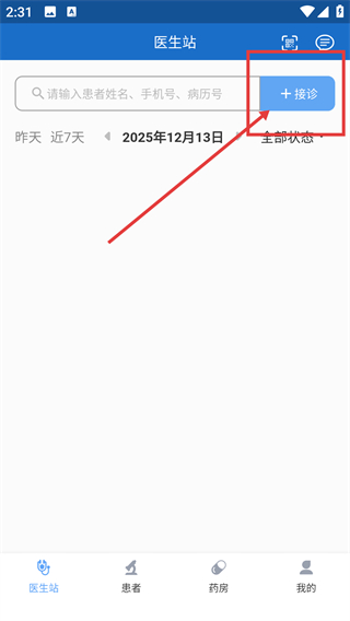 1、在医生站页面点击【+接诊】按钮,就能进入病历书写界面,开始记录患者的就诊信息啦。