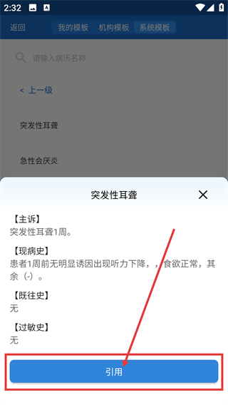 4、选中目标病历模板(比如【突发性耳聋】)后点击【引用】,就能将模板内容导入到病历中啦。