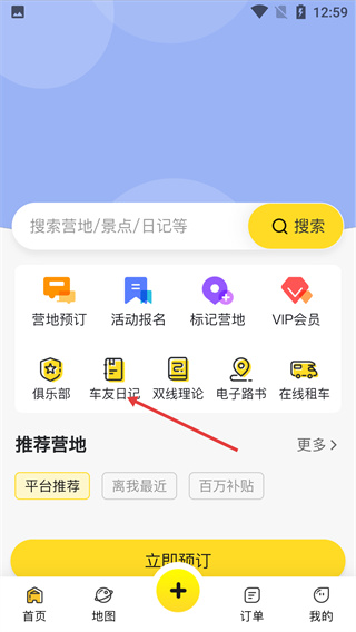1、在首页功能区找到“车友日记”选项并点击,进入车友日记的内容展示页面,可查看相关日记内容。