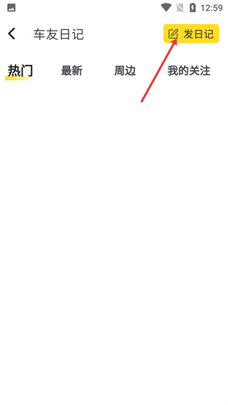 2、进入车友日记页面后,点击右上角的“发日记”按钮,进入游记内容的编辑页面,准备发布新日记。