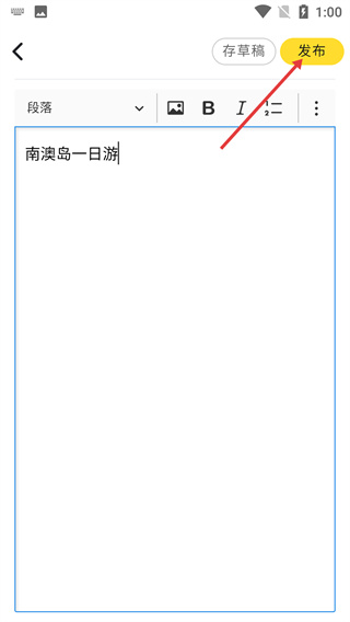4、填写好游记内容后,点击右上角的“发布”按钮,完成车友日记的发布。