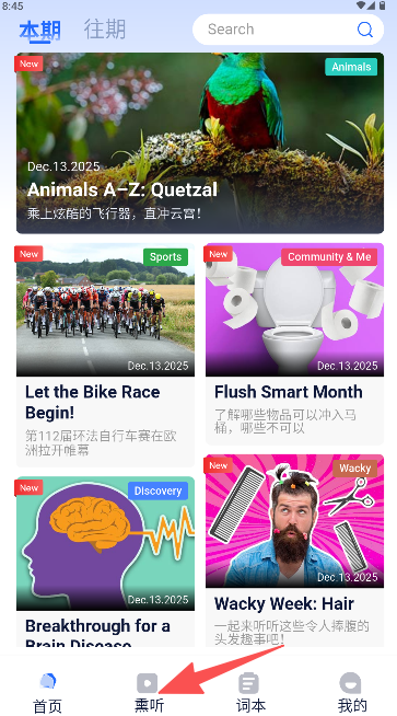 1、打开软件点击底部导航栏的“熏听”按钮进入界面。