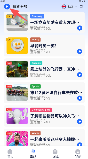 2、在熏听列表页点击左上角“播放全部”按钮。