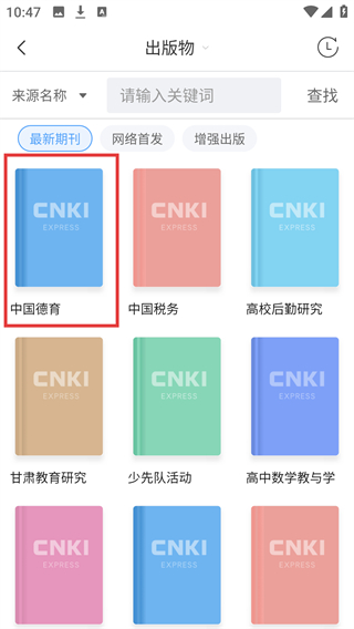 2、进入【出版物】页面后,在【最新期刊】分类下找到【中国德育】并点击,该页面还可通过关键词搜索出版物。