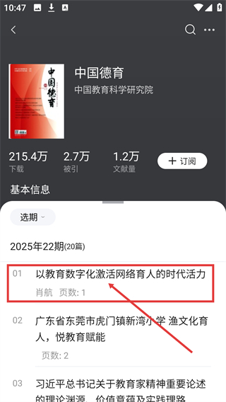 3、进入【中国德育】详情页,找到2025年22期下的【以教育数字化激活网络育人的时代活力】文章并点击。