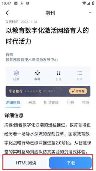 4、进入文章页面后,可查看摘要等信息,点击底部【HTML阅读】或【下载】按钮,即可进行阅读或下载操作。