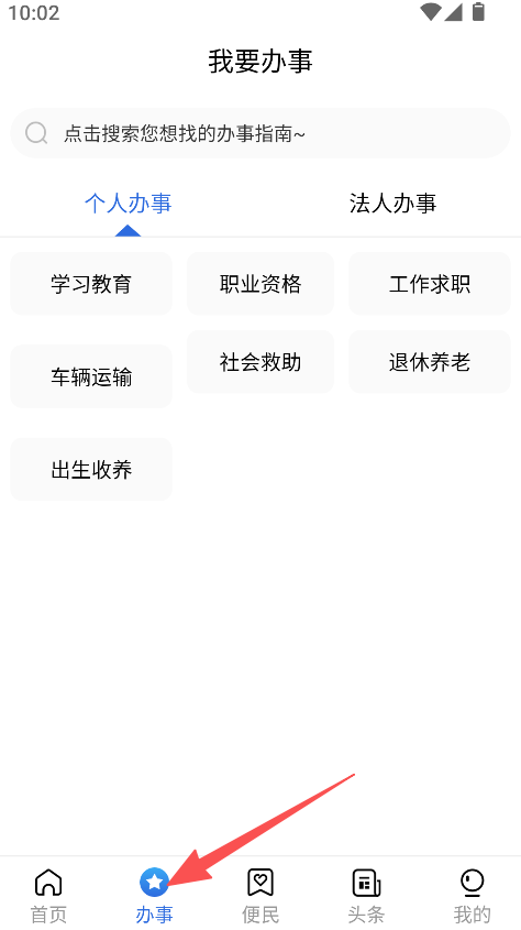 1、打开软件进入办事板块,选择个人办事或法人办事分类。
