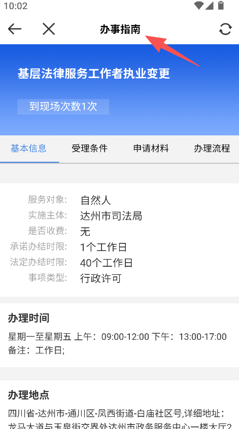 3、办事指南信息详实,含办理时间、地点等内容,无需额外咨询即可获取关键办事信息。