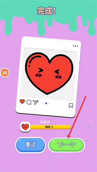 4、完成【心形图案】的绘制与填充后,查看【准确率-100%】的结果,点击【下一个】按钮进入后续关卡。