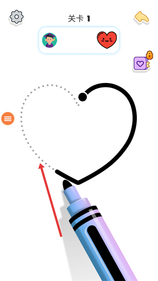 1、按照【关卡1】的虚线轨迹,用马克笔跟随【虚线心形】的路径进行绘制,逐步勾勒出图案的基础轮廓部分。