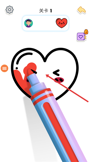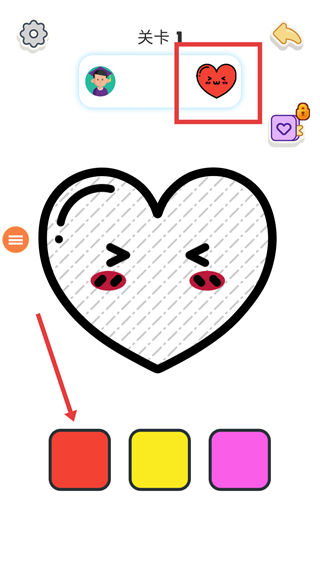 3、在【关卡1】中选定颜色后,使用马克笔对【心形区域】进行填充操作,覆盖图案对应的空白部分。