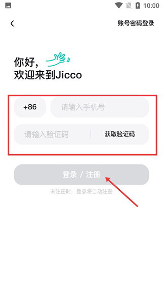 1、在Jicco的登录页面,输入手机号并获取验证码填入,点击【登录/注册】按钮,未注册时会自动完成注册流程。