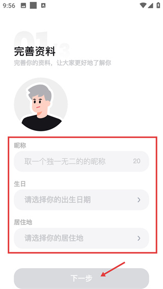 2、进入完善资料页面,填写昵称、选择生日与居住地,完成后点击【下一步】按钮进入偏好设置环节。