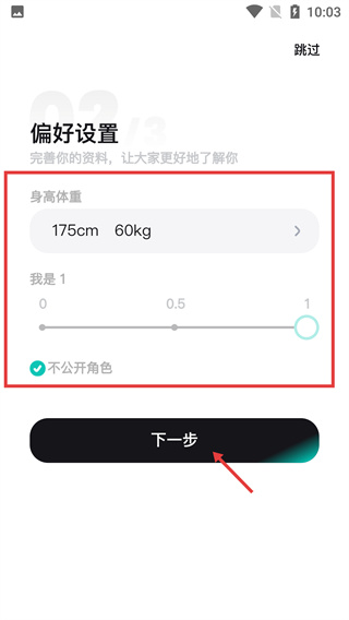 3、在偏好设置页面,配置身高体重及相关偏好,确认后点击【下一步】按钮进入圈子选择环节。